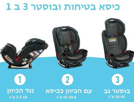 * כיסא הבטיחות משולב בוסטר 3 ב 1 המתאים מגיל לידה ועד גיל 10, ממשקל 2-45 ק"ג