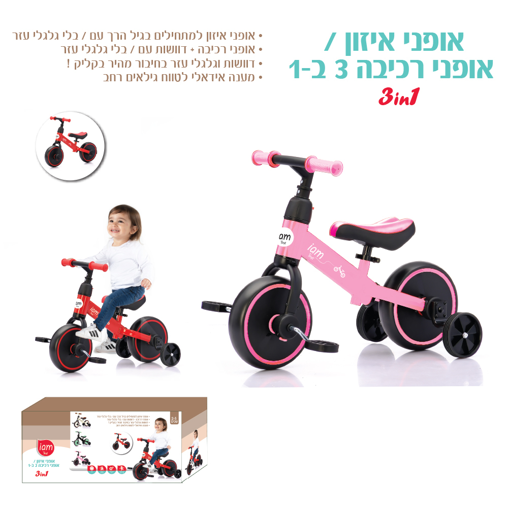 אופני איזון IAM וגלגלי עזר 2 ב 1 אופני ילדים מפוארים שניתן להתאים בקלות לשלב הרכיבה של הילד ולהעדפותיו. מצב ראשוני- ניתן להסיר את הפדלים ולהשתמש במוצר כאופני איזון לעידוד הביטחון והאיזון העצמי של הילד. ובשלב מתקדם יותר כאשר הילד צבר ביטחון ואיזון באופן עצמאי ניתן להשתמש כאופני רכיבה ע"י חיבור הפדלים וגלגלי העזר ללימוד טכניקת הפידול. גלגי האופניים עשויים מחומר eva ולכן אין צורך בניפוח אוויר ותחזוקה.