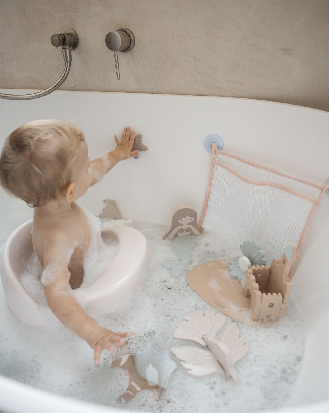 חלקים שתוכלו להרכיב וליצור עולם מופלא של דמיון מתוך האמבטיה, כל חלקי המשחק צפים במים ויכולים גם להיצמד לדופן האמבט ולאריחים. משחק ההרכבה מתאגר ותורם להתפתחות המוטוריקה והדמיון של הילד, מושלם לזמן איכות ושמחק משותף של הפעוט עם הוריו או עם אחיו הגדולים. חלקי המשחק עשויים קצף EVA דחוס ואיכותי אשר אינו סופג מים ומצמצם הצטברות עובש. בתום השימוש מומלץ לתלות את חלקי המשחק לייבוש בסל הרשת, הנצמד לאריחי האמבטיה ומאפשר איסוף וייבוש של כל החלקים בנוחות. סל הרשת נצמד לאריחים חלקים נקיים ויבשים בלבד.